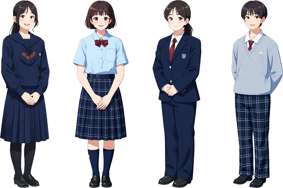 有志生徒がデザイン定規した冬服のスラックスはブレザーと合わせることもできます。 - 2018年度よりモデルチェンジした夏服は、有志生徒がデザインを提案しました。ブラウスの色を白・青からお選びいただけます。