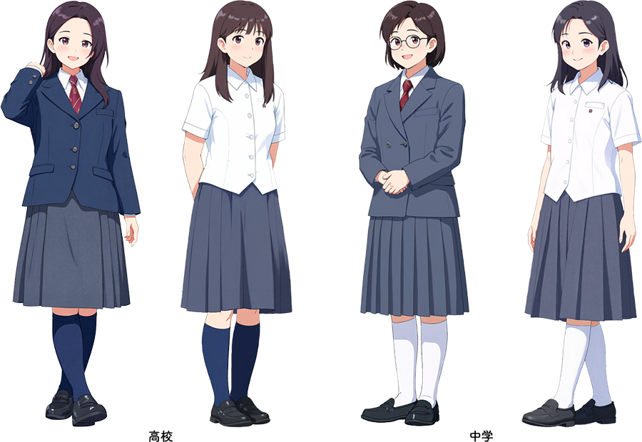 - 中学校と高校で制服のデザインが異なります。中学校の制服は、長年親しまれてきたグレーを基調とし、活動的でのびのびとした中学生の姿をイメージしたプリーツスカートが特徴です。高校の制服は、自立した凜とした女性像をイメージし、落ち着きと品格を大切にしたデザインとなっています。