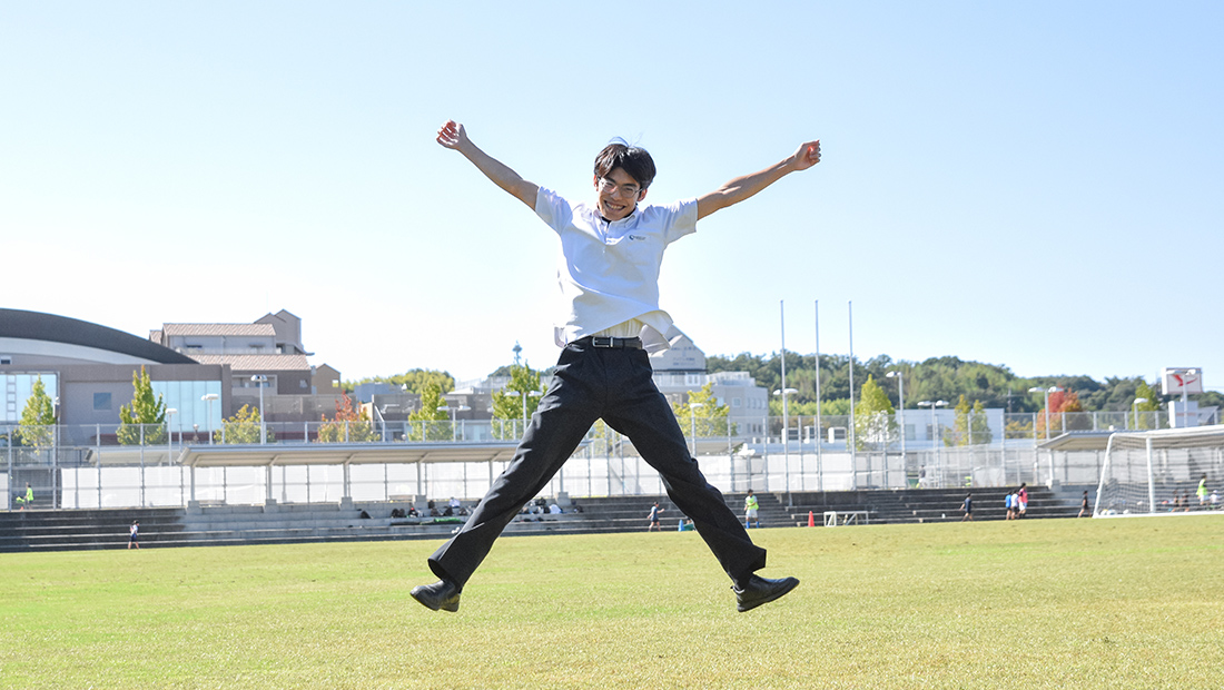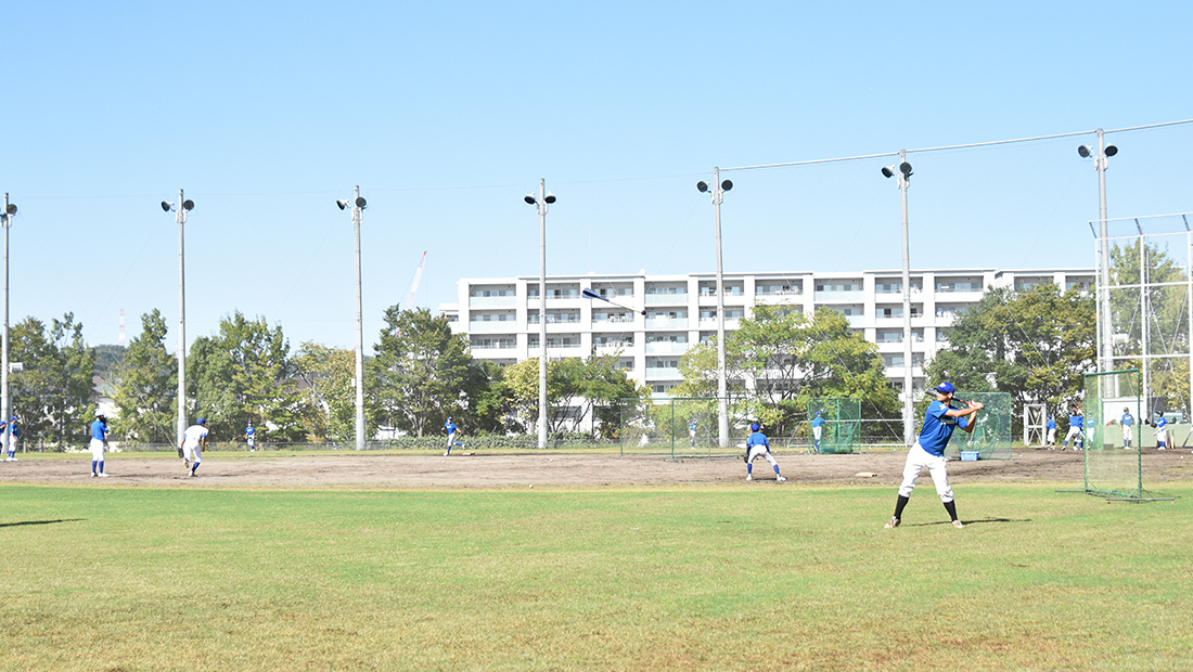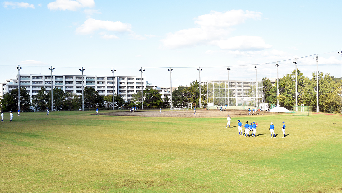 総合グラウンドは、野球部とサッカー部が同時に練習できる広さを持っています。しかも、敷地は全面天然芝! 1年を通してメンテナンスされているので、芝の緑はいつも美しく映えています。また、夜間照明があるので、部活を頑張る生徒は日の入りが早い冬でも放課後まで練習することができます。