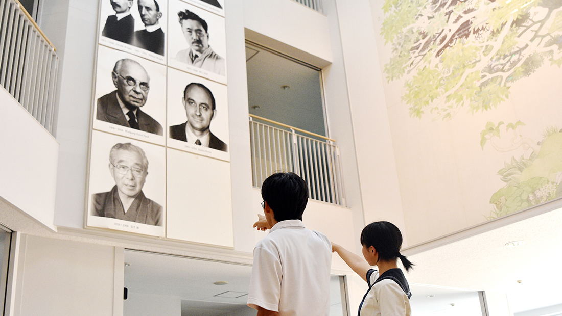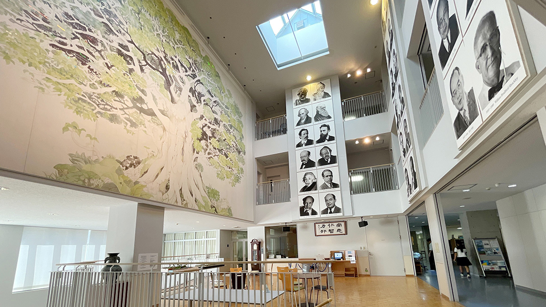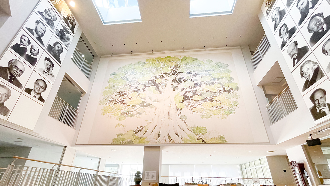 吹き抜けの空間が広がるサイエンスホールは、季節の光が降り注ぐ本当に気持ちの良い場所。壁面には世界の偉人の肖像画や写真が掲げられ、正面には偉人たちの名言が散りばめられた「言万葉(ことのよろずは)の絵樹」があります。その壮観さは、ナラトミを初めて訪れた人なら誰しも足を止めて見入ってしまうほどです。