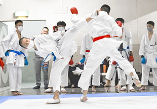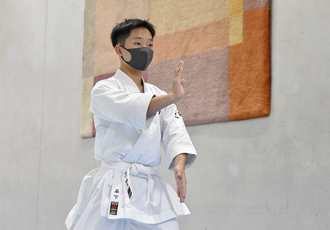僕は、今年の6月にキャプテンになりました。中学ではバスケットボール部でしたが、昨年度の空手道部キャプテンだった先輩も同じバスケ部出身で、尊敬していた先輩を追いかけて僕も空手道部に入りました。空手は未経験でしたがが、体験に誘われて見学に行ったら最高に格好良くて(笑)。迫力と力強さと見たことのないような真剣な表情に一目惚れし、「これは入らなあかん!」と思って入部しました。今は「形」と「組手」の両方に取り組み、メインは団体の「形」ですが、「組手」もスタメンで出場させていただいています。