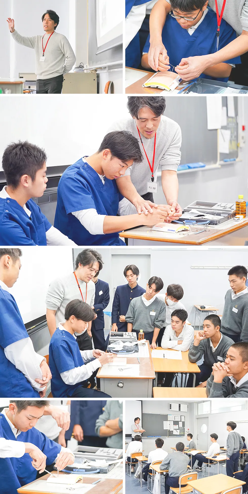 さらに、実際のメスや鉗子などの手術器具を広げた村上さんに、生徒たちは「すごい!!」と興奮を隠せない様子。人工皮膚が使った研修医向けのトレーニングセットを教壇に設置し、メスの持ち方、ピンセットの展開操作、針での縫合まで、手首や指の使い方を示しながらデモンストレーションを行い、甲南生たちの尊敬を集めました。