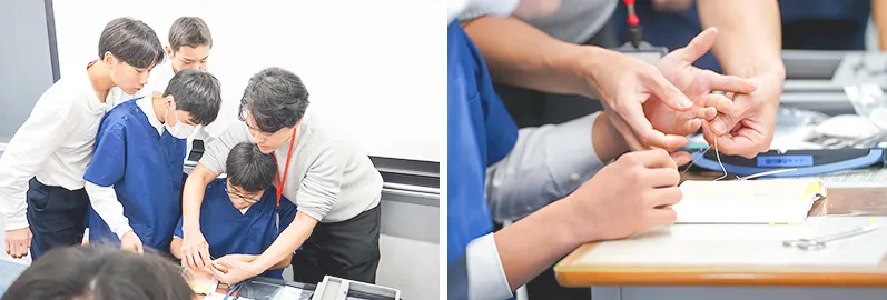 続いて、生徒たちも村上さんのアドバイスを受けながら、切開や縫合を楽しそうに体験。外科医を志す声もあがり、「今日が医者をめざすきっかけになれば嬉しい」と村上さんも笑顔に。最後まで生徒からの質問にていねいに応え、ワークショップは終了しました。