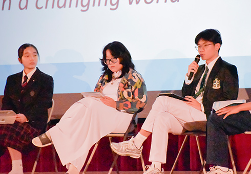 『国際シンポジウム2025』のテーマは『Leadership in a Changing World(変わりゆく世界におけるリーダーシップ)』。司会役の清風南海生から投げかけられるクエスチョンに、5カ国の高校生が英語で意見を述べました。ディスカッションの一部を日本語訳でご紹介!