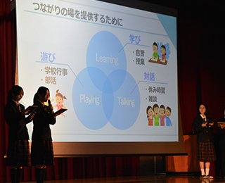 国際シンポジウムはすべて英語で行われます。パネルディスカッションでのパネリストや司会進行役、今年から始めた留学生によるプレゼンテーションの司会進行を含め、運営係として国際シンポジウムに関わる生徒を中心に、英語に真剣に取り組む生徒が毎年現れることにも、取り組みの効果を実感しています。また次年度の担い手として中学3年生を見学させていることが、効果の継続につながっています。