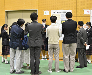 シンポジウムの後には、グローバル探究ゼミの生徒による「探究成果発表会としてプレゼンテーションとポスター発表も行っています。こちらも高校2年生には英語発表または英語併記での発表を推奨しており、留学生やSGHの繋がりでお招きしている国内招待校の生徒さんたちと活発な質疑応答が見られます。今後も試行錯誤しながらこのイベントを進化させていきたいですね。