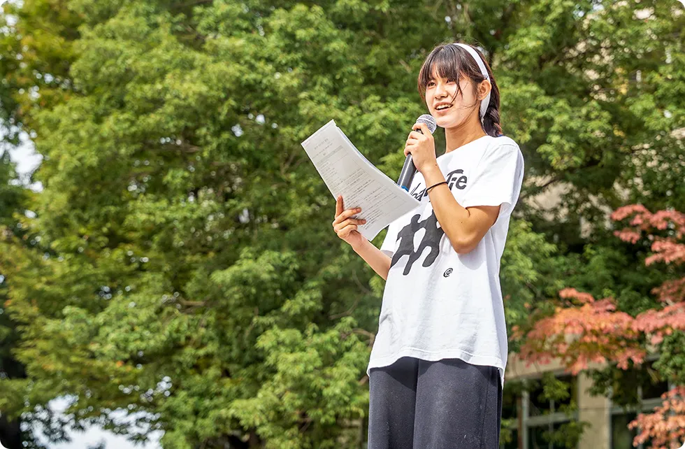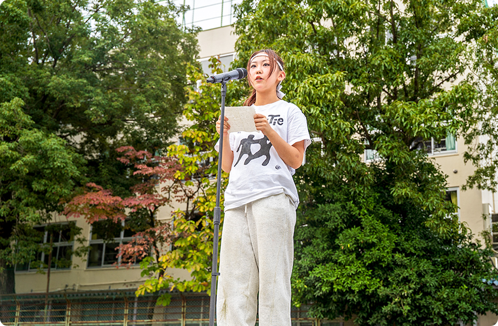 これまでの私は、みんなの前で話すために自分の話をまとめたり、相手に伝わるように話したりするのがかなり苦手で、緊張してしまうタイプでした。だから、相手に伝わるスピーチ内容や話し方を考えられるようになったことは、大きな成長だと思います。普段の授業でもあまり手を挙げるタイプではありませんが、実行委員に参加したことで、少し自分の気持ちを伝えられるようになれたと思います。
