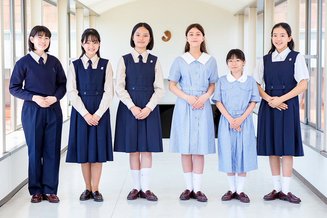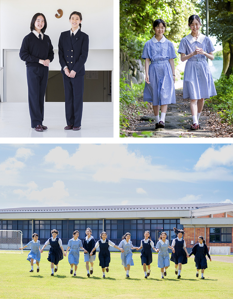 清泉の正装は、ベージュのブラウスと紺のジャンパースカート。創立以来変わることのない、そして世界中の多くの姉妹校も採用している独特の制服です。入学式・卒業式・創立記念日のミサは正装で参列します。