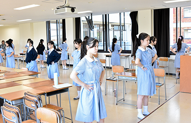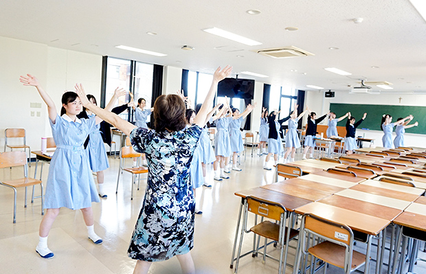 土曜午後から始まる音楽部の練習は、ストレッチや筋トレからスタートします。トレーニングは、土曜は30分、平日は10分間がルーティン。呼吸や筋肉を意識しながら「プランク」、「腹筋」、「スクワット」で体幹を鍛えたあと、力を抜くために「こんにゃく体操」を行います。そして、発声練習へ。