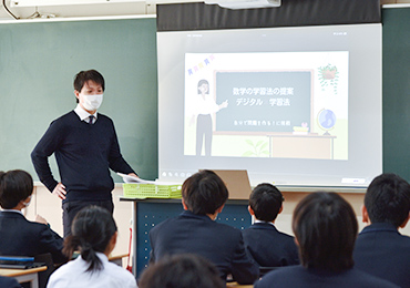 前田先生私は中学1年の各クラスで「デジタル×個別学習法」という授業を行いました。普段の授業を通して、生徒には「自分で考える力」を身につけてほしいと感じたことが、この授業を実施するきっかけになりました。定期テストや入試では、「解ける問題からしっかり点数を取る」ということが大事です。しかし、普段の勉強では、むしろ1問に対してじっくり向き合って考えるということも重要になってきます。そのような経験をする事は、思考力を育むことにもつながってくるのではないかと感じています。そのため、フロンティアウィークの数学の授業を通して、「自分で考える」とはどういうことかを、生徒自身に気づいてほしいと思いました。